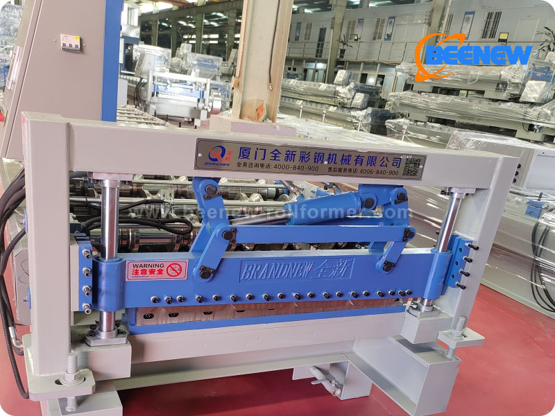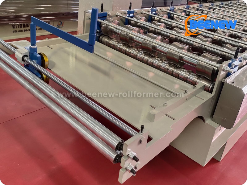 Cette machine de toiture de formage de rouleau est une conception intelligente pour l'ingénieur de toiture en métal, compte tenu de chaque largeur de bobine en acier sera légèrement différente, de sorte que le guide d'alimentation du matériau est réglable pour répondre à l'utilisation réelle. Il y a une pré-cisaillement manuelle avec un dispositif de guidage de matériau, il coupera la tête du matériau lorsque la tâche de production est presque terminée.