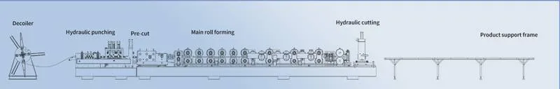 Machine de déroulement → Mandrin de formage → Système hydraulique → Système de contrôle automatique → Mécanisme de formage étape par étape → Mécanisme de cisaillement automatique → Table de réception du produit fini. Les processus de base comprennent le poinçonnage hydraulique et la découpe hydraulique.
